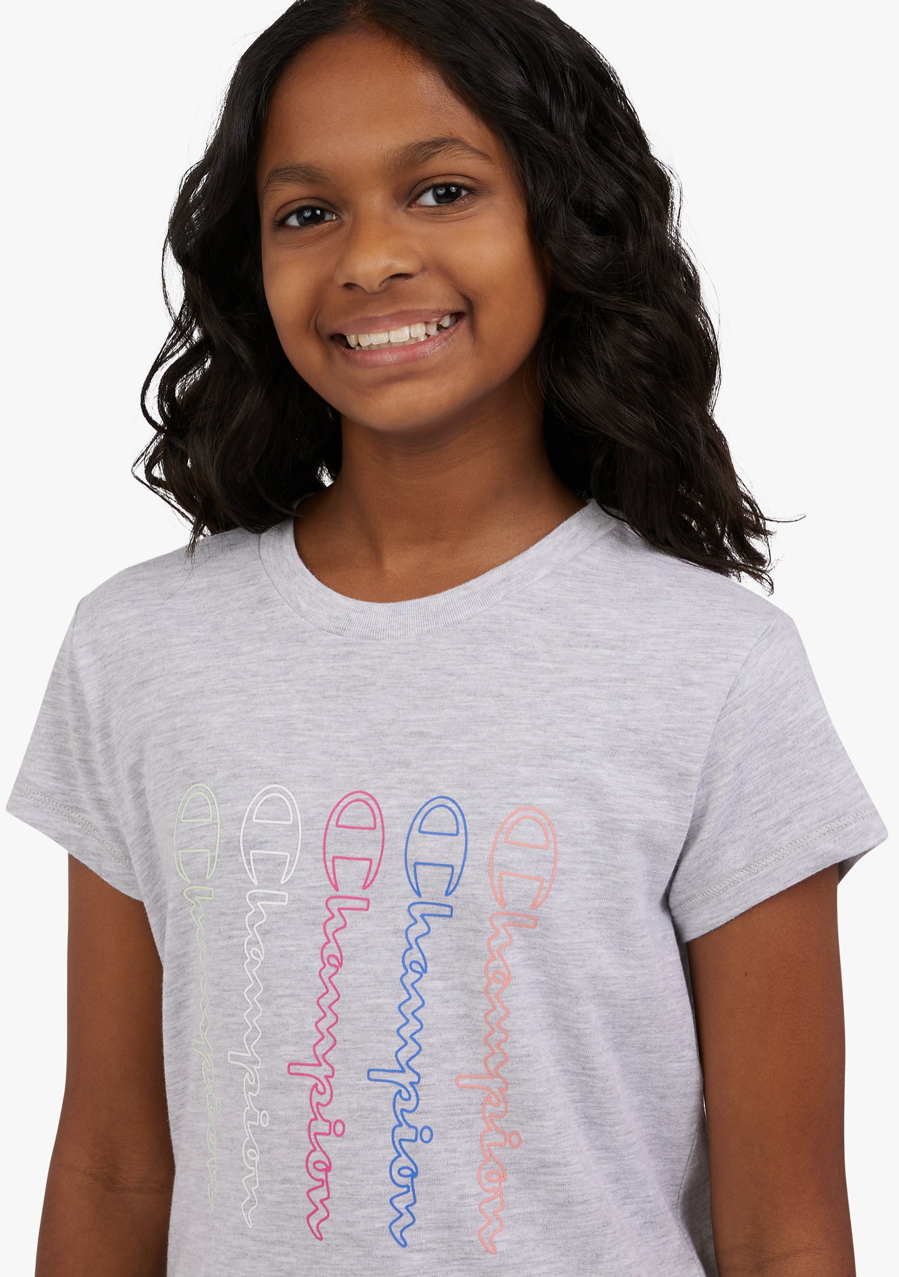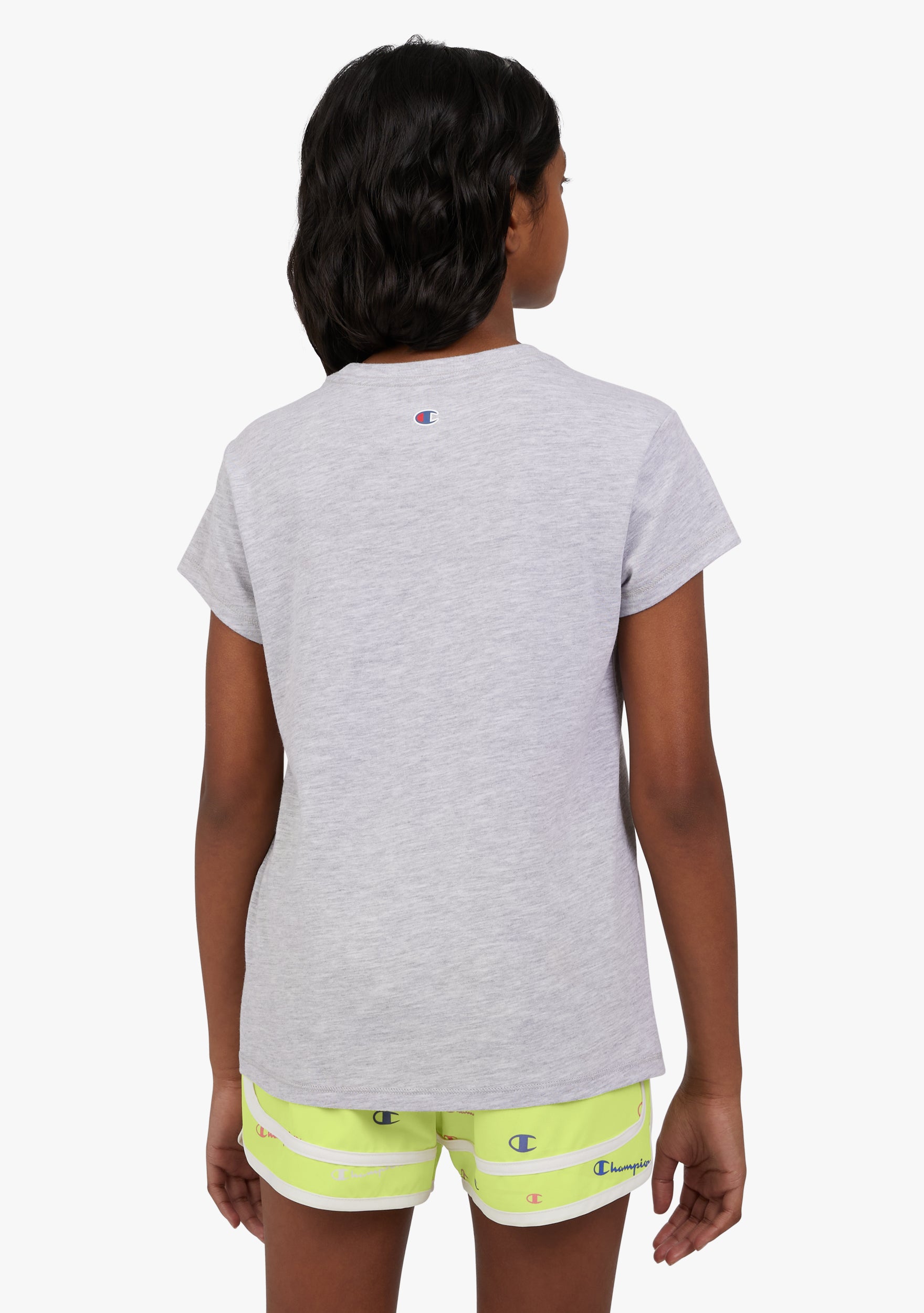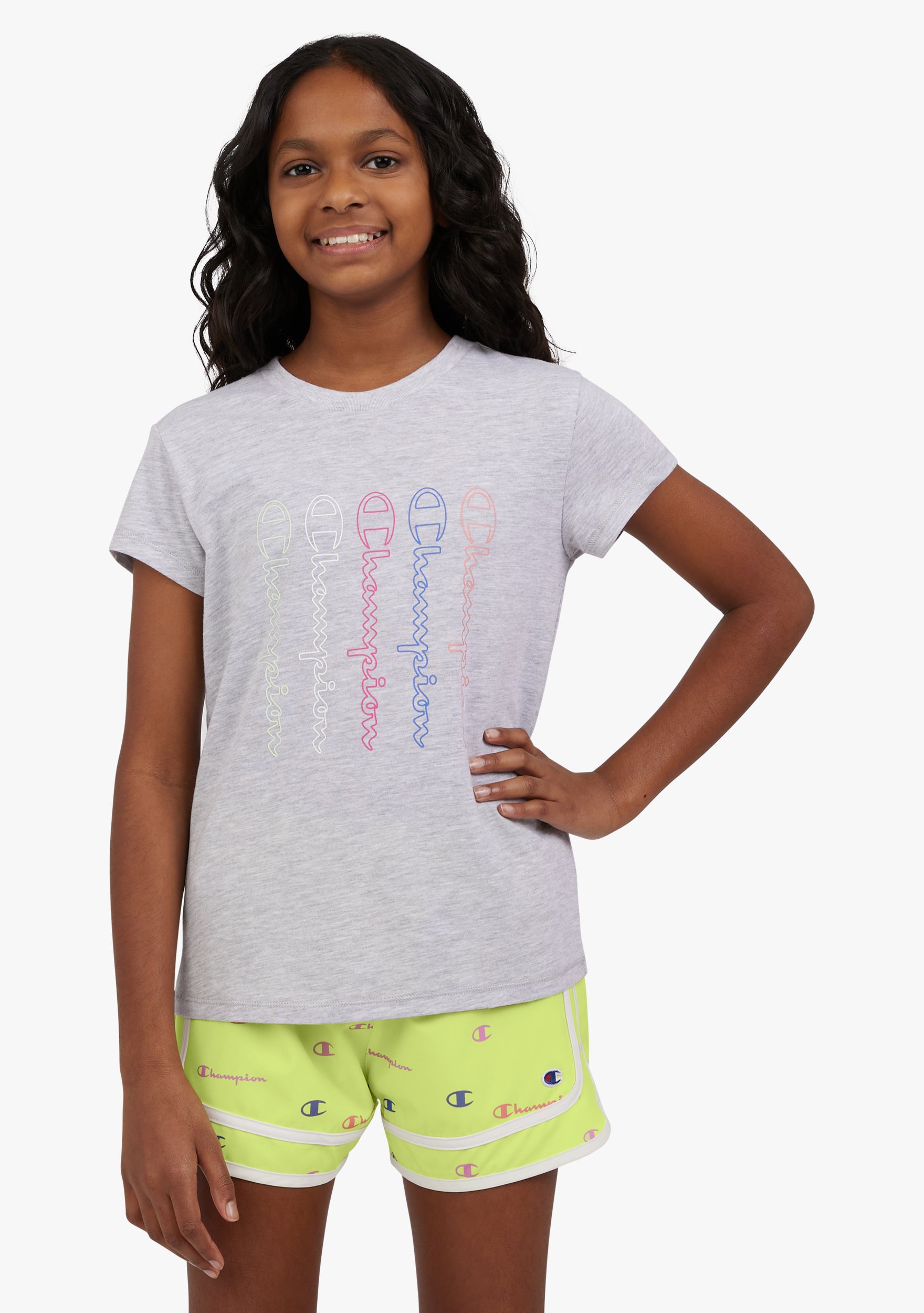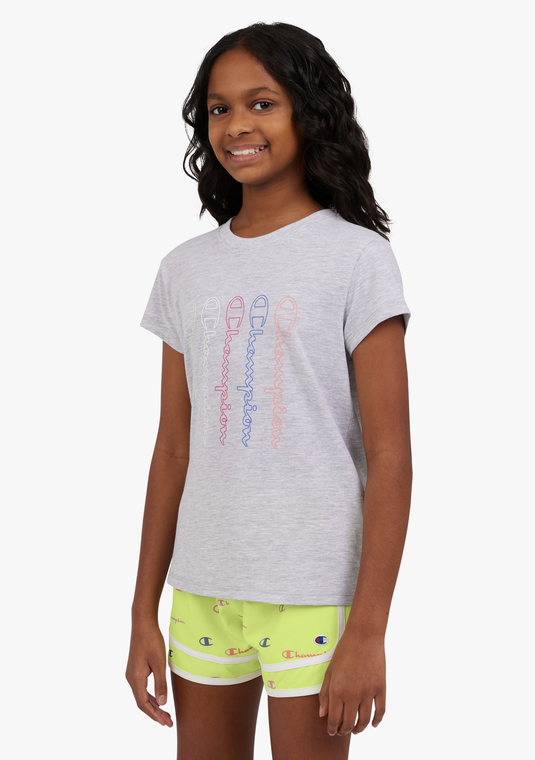 There’s no better way to showcase Champion pride than with one of our bold graphics. Crafted in soft. breathable cotton jersey. this girls’ graphic tee will keep her comfy from playtime to downtime. It comes in a variety of unique. colorful graphics. so she can choose her favorite (or collect them all). Cute. lightweight. and easy to wear. this versatile girls’ t-shirt can be paired with joggers. denim. or even a little skort. It’s sure to be a repeat in her fall wardrobe.