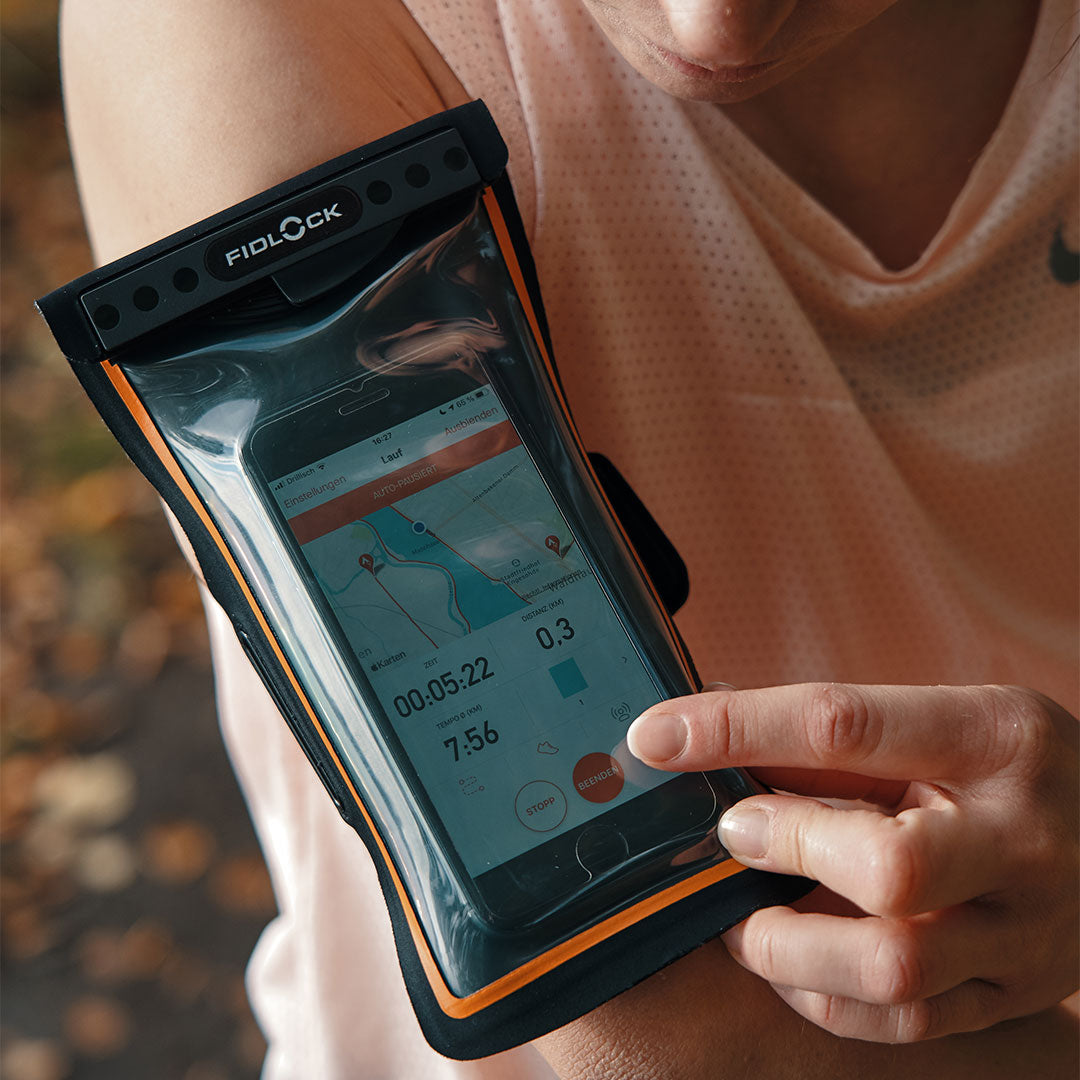 If you are surprised by a downpour while running. the bag on the upper arm is already prepared. Whether it is a drizzle or a rain shower – thanks to the hermetic closure technology. the smartphone is 100% protected against water and even the finest dust.