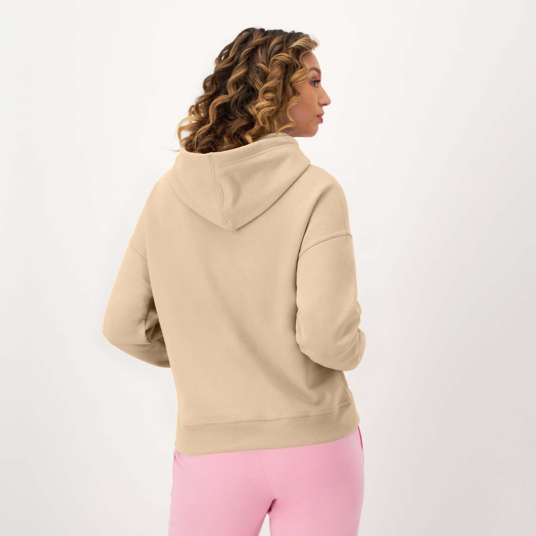 With its comfy. loose fit. this Powerblend® Hoodie for women takes you from warm-ups to weekends in laid-back style. This soft cotton blend pullover hoodie has a brushed interior that keeps you warm without the weight. Durable fleece fabrication that resists pilling and shrinkage makes this sweatshirt an instant lifer. The dropped shoulders and loose fit pair perfectly with your best Champion shorts and leggings. while the pass-through kanga pocket makes storing the essentials easy. The double-lined hood adds warmth and makes this sweatshirt a great layering piece. The look is made complete by the full classic script logo spanning the chest and the C logo at the wrist. so everyone knows what you’re all about.